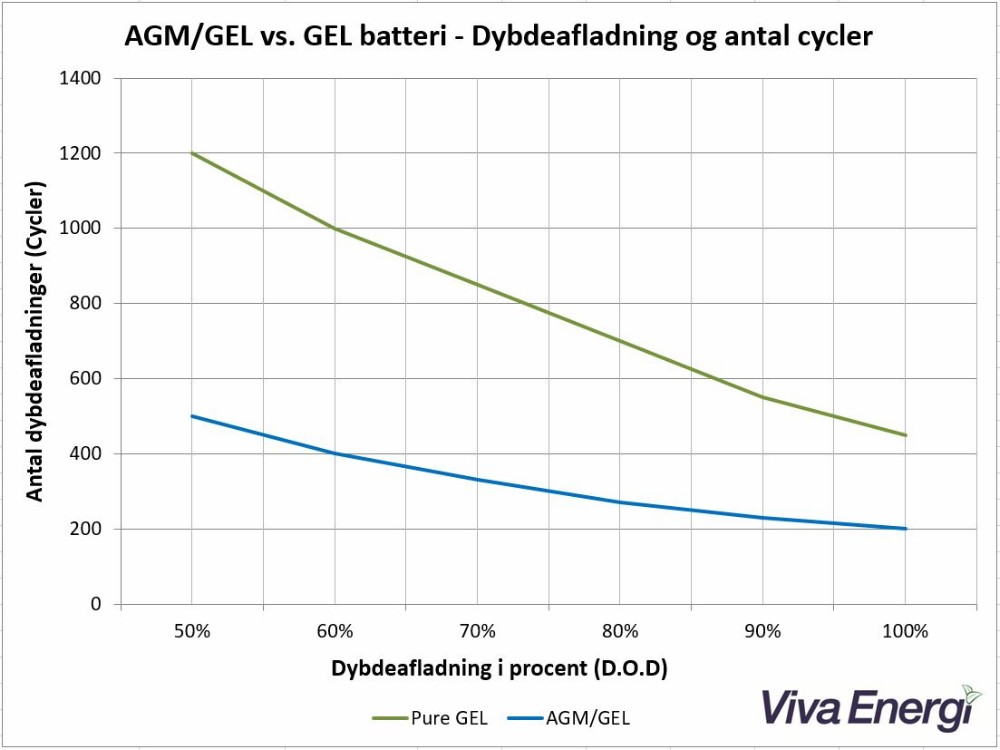 Batteriets levetid er et udtryk for det antal antal dybdeafladninger, som det er specificeret til ved en given afladning, fx. 50% afladning. Antallet af dybdeafladninger afhænger meget af hvor dybt batteriet bliver afladet. På diagrammet herunder kan du se de forventede antal dybdeafladnigner for AGM/GEL og Pure GEL batterier.
