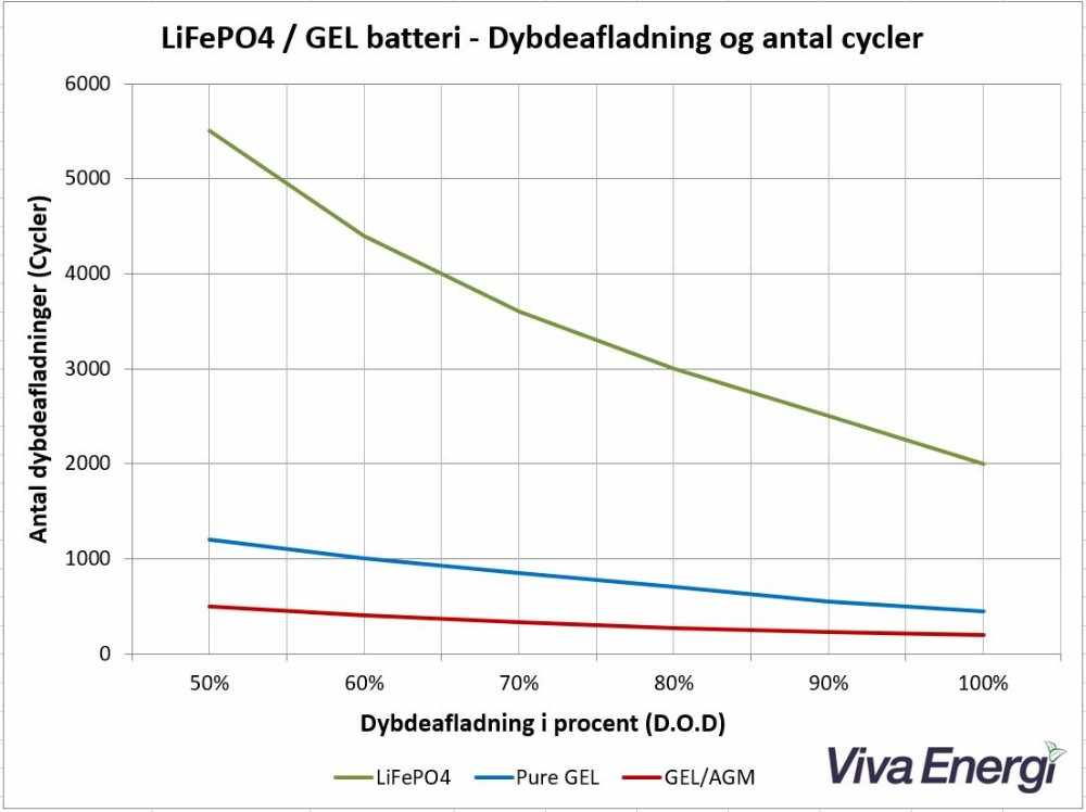 Hvis du bruger et solcelleanlæg i sommerhalvåret (fx. 150 dage), så anbefaler vi en dybdeafladning mellem 40-60% for vores gelé batterier, og op til 90% for lithiumbatterier.