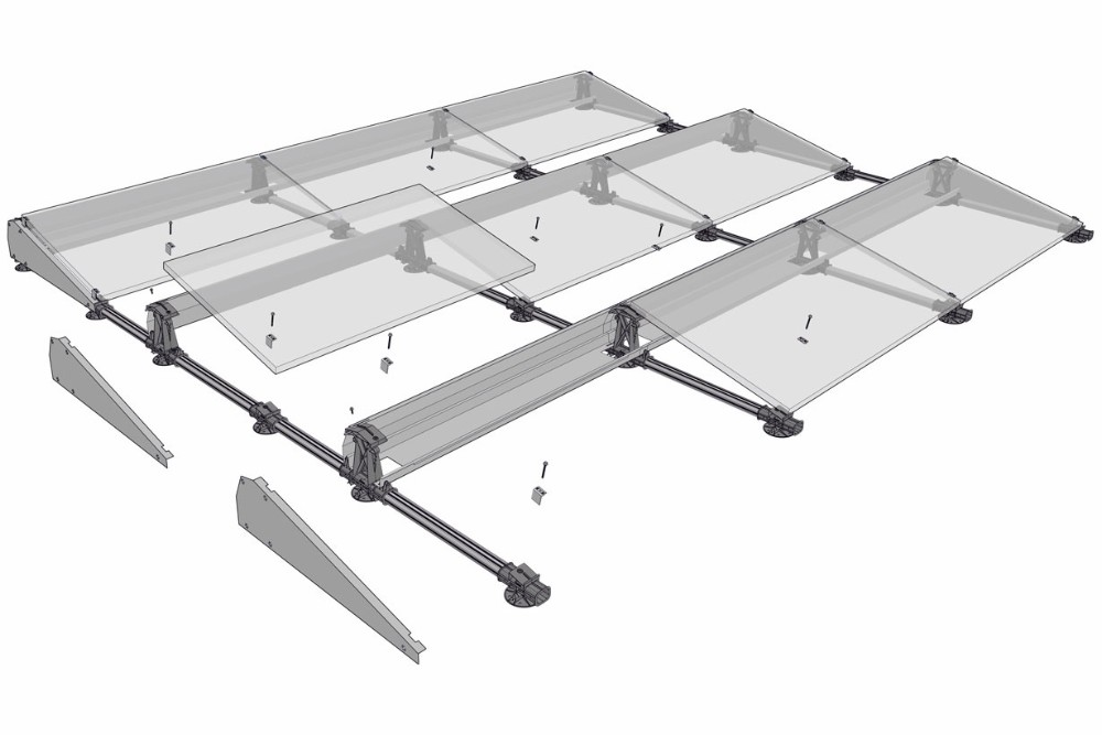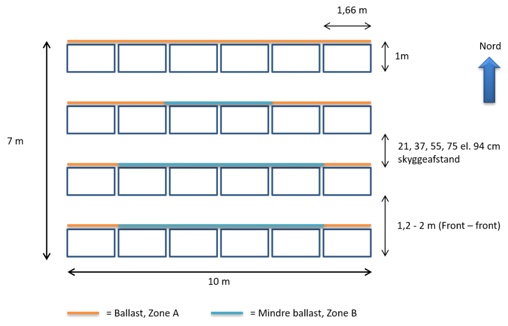 Systembredde pr. panel er ca. 166cm, og standard rækkeafstand er 94cm. Rækkeafstanden er optimalt ca. 1m, for at undgå skygger om vinteren, men afstanden kan ændres til hhv. 75, 55, 37 eller 21 cm. Hvis man sætter rækkeafstanden ned til 55cm mister man ca. 6-8% produktion om året.