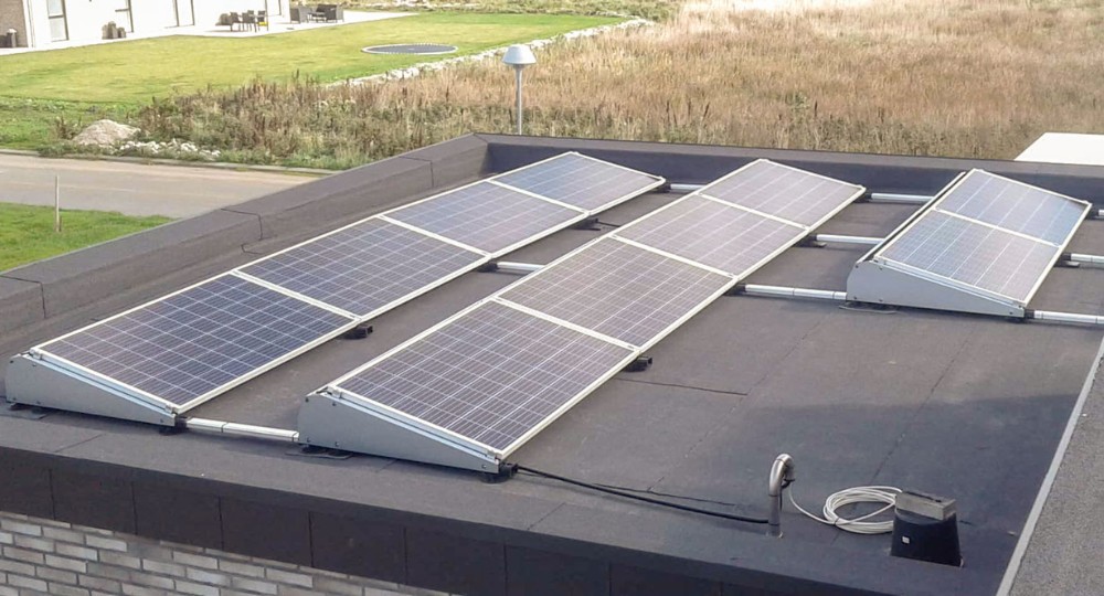 Vi ønsker ikke at bore i fladt tag med fare for utætheder (typisk tagpap). Derfor benytter vi et ballast solcellesystem, som hedder FlatFix fra hollanske Esdec. Der findes to systemer, et sydvendt anlæg med skyggeafstand mellem rækkerne, og et øst/vest anlæg, som udnytter taget optimalt. Begge systemer finde i alufarver eller sort.