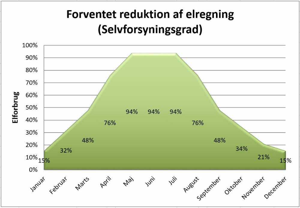 Nedenfor ses den total elbesparelse set over 30 år (anlæggets levetid). Forventede omkostninger til vedligehold og batteriskift er fratrukket besparelsen.