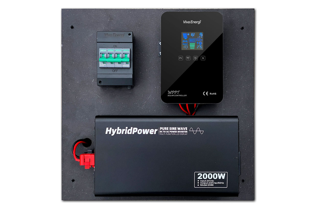 Komplet og færdigmonteret kontrolplade som blot skal tilsluttes 24V batterier og solcellepanel(er). Denne model udmærker sig ved at levere en større effekt til strømslugende udstyr som kaffemaskine, elkedel, brødrister, mikrobølgeovn og andre enheder (uden motorer) der bruger under 2000W i kortere tid (5-15 min).