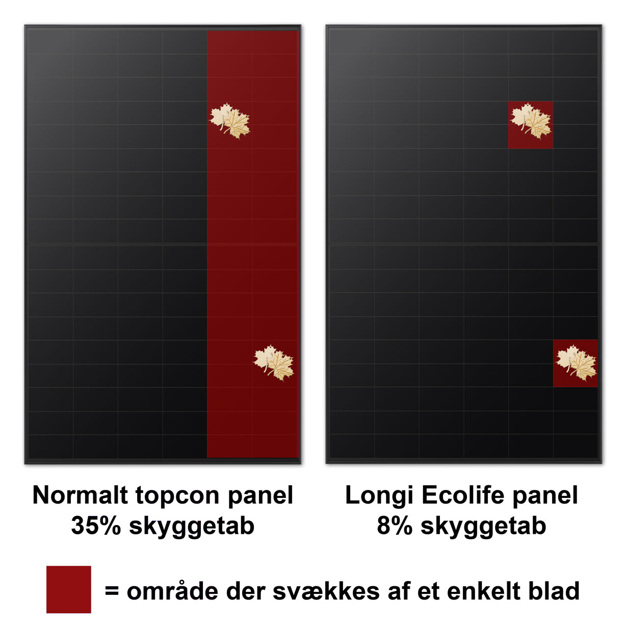Longi Ecolife har en enestående skyggeoptimerings-teknologi, som betyder, at hvert panel er skyggeopdelt ned til de enkelte celler. En skygge på en celle vil så kun påvirke denne celle og ikke en stor del af panelet. Dette nedsætter skyggetabet fra 35% til kun 8%.