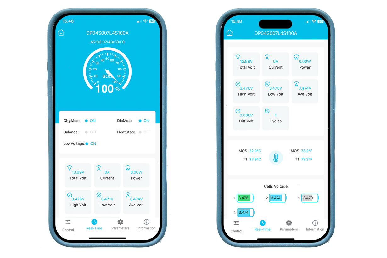 Batteriet kan overvåges fra en smartphone (Android eller iPhone), hvor man via en bluetooth forbindelse kan se batteriets status. Man kan bla. se: